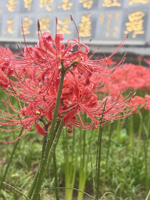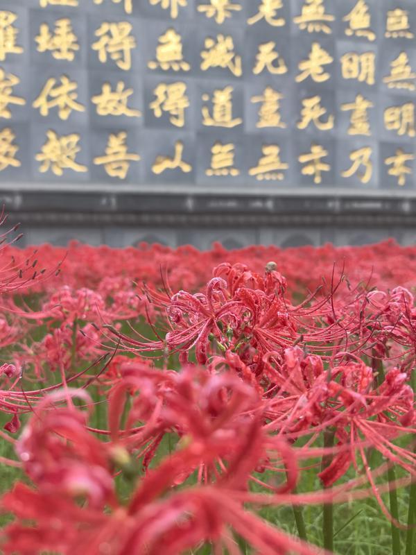 在观赏区,大片红色彼岸花盛开,与静谧古朴的环境相映成趣,虽然还在下着小雨,但仍吸引着众多游客拍照观赏。