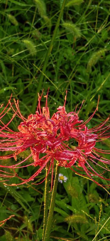 走近欣赏,只见一簇簇彼岸花造型别致,花茎挺拔,顶端的花朵红似火,细长的花丝向外舒展,犹如龙爪,又像绽放在地面上的红色烟花,明艳耀眼,带着雨滴的花朵显得格外娇艳,让人感受它们在自然生态中肆意生长的姿态。偶有悠闲踱步的猫穿梭花间,更为眼前景象增添了几分灵动趣味。