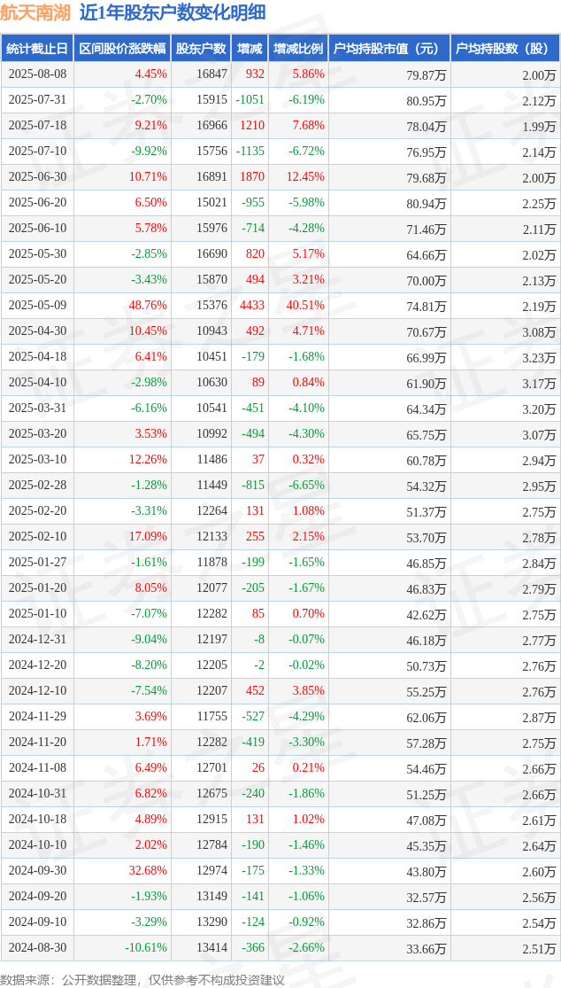 从股价来看,2025年7月31日至2025年8月8日,航天南湖区间涨幅为4.45%,在此期间股东户数增加932.0户,增幅为5.86%。